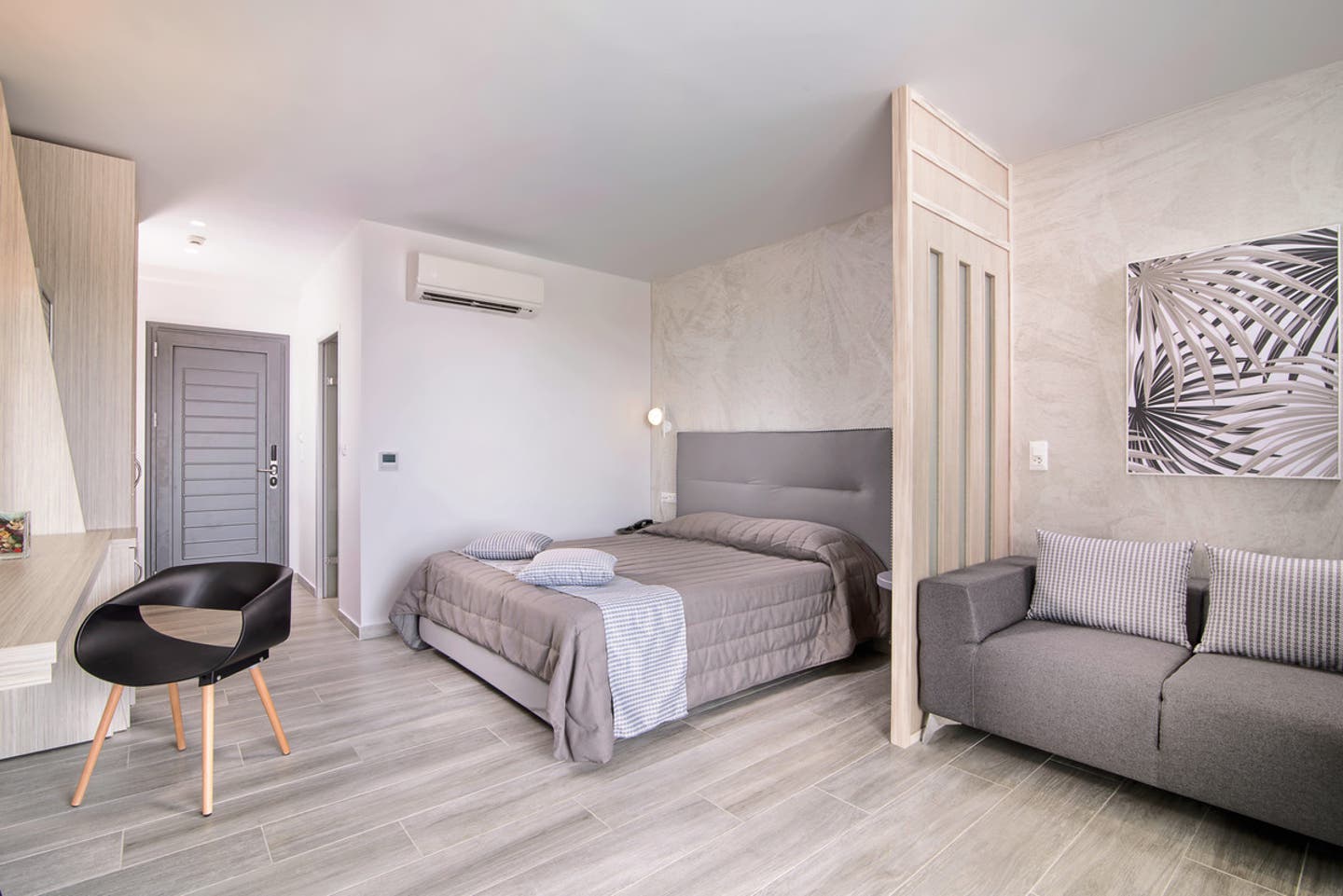 Insgesamt 90 Wohneinheiten beherbergt das Hotel Lagomandra Beach. Die lichtdurchfluteten, großzügig geschnittenen Zimmer und Suiten bieten neben Balkon oder Terrasse teilweise Meerblick. Eine individuell regulierbare Klimaanlage und Heizung gehören zur Standardausstattung. Die komfortable Einrichtung präsentiert sich mit viel Holz und sanften Naturfarben.
