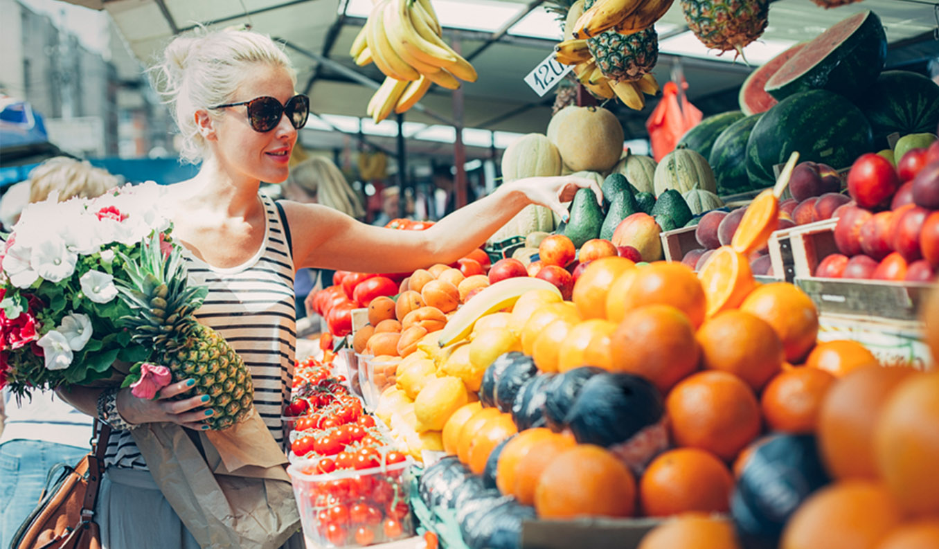 Frisches Obst und Gemüse, ein Fischstand und allerlei Feinkost.